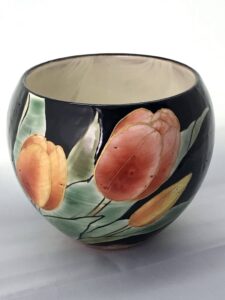 こちらは先ほどご紹介した陶あんの作品です。チューリップの絵柄が特徴的で、丸みを帯びたフォルムからとても柔らかな印象を受ける湯呑です。