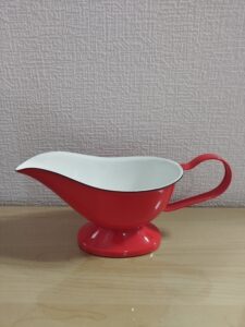 こちらは製造元不明のグレイビーボートになります。皆様にはカレーポットという名称のほうがなじみ深いかもしれません。もともとはグレイビーソースという肉料理用のソースを入れるためのものでした。ステンレス製のものが一般的ではありますが、ホーロー製品も多数生産されています。